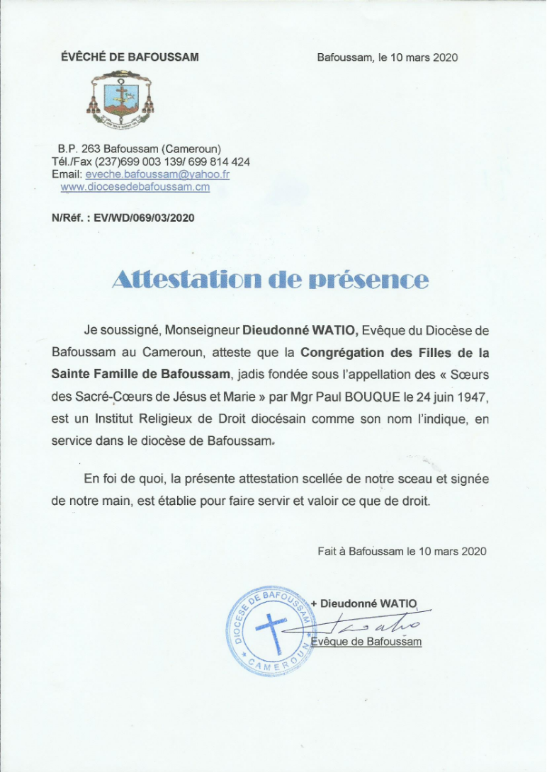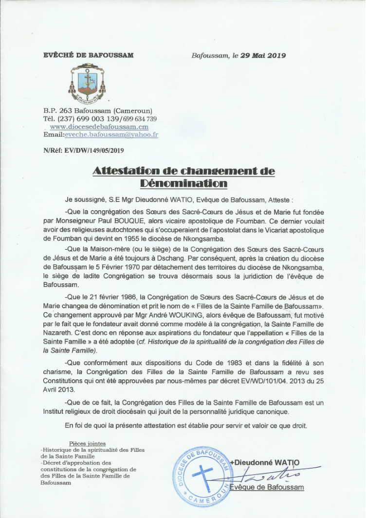 Le Diocèse de Nkongsamba fut divisé en deux le 5 février 1970 et donna naissance au Diocèse de Bafoussam. Avec cette division, le siège de la Congrégation (Dschang) se trouvait dans le territoire du nouveau Diocèse de Bafoussam. C’est ainsi que la Congrégation des Sœurs des Sacrés Cœurs de Jésus et de Marie fut désormais placée sous la juridiction de l’évêque de Bafoussam. Le 21 février 1986, se tint le premier chapitre constitutionnel formalisé. Au cours des travaux, une commission « ad hoc » fit remarquer que le fondateur avait mis un accent particulier sur la Sainte Famille de Nazareth et l’a donnée comme modèle à la Congrégation. En vue de mettre en lumière et en valeur ces aspirations profondes du fondateur, le Chapitre décida de changer la dénomination de la Congrégation qui devint « Congrégation des Filles de la Sainte Famille de Bafoussam ». Ce changement fut approuvé par Mgr André WOUKING, alors évêque de Bafoussam.